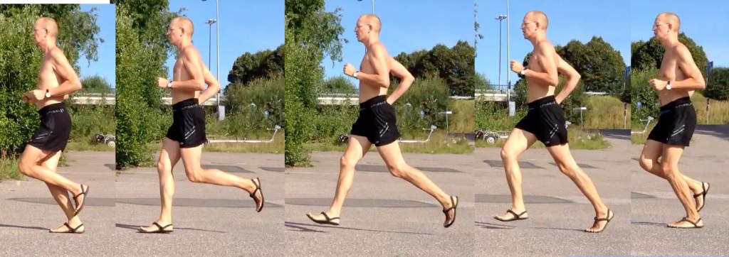 Kuva 3. Juoksija nostaa oikean jalan polven ylöspäin samalla vapauttaen akillesjänteeseen varastoidun voiman. Huomaa kuinka säären ja pohkeen lihakset aktivoituvat.